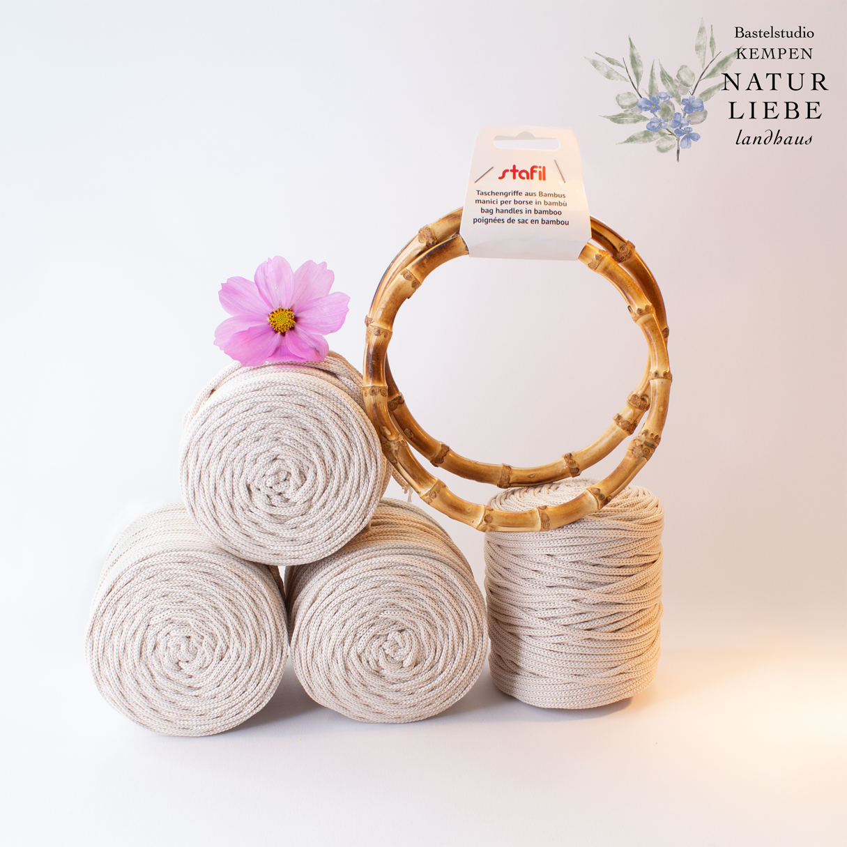- 4 x Polyester Garn 3mm: Farben nach Wahl (Altgold, nude, Karamell, Vanille, Hortensie, Stahlgrau, Natur) Andere Farben auf Anfrage.