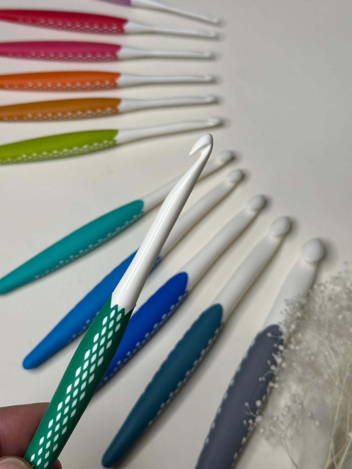 Die farbigen Griffe dienen gleichzeitig als praktische Größenkennzeichnung – so findet man die richtige Nadel sofort im Handarbeitskorb. Die Häkelnadel besteht aus hochwertigem High-Performance-Kunststoff, ist flexibel, sehr leicht und besonders angenehm in der Handhabung
