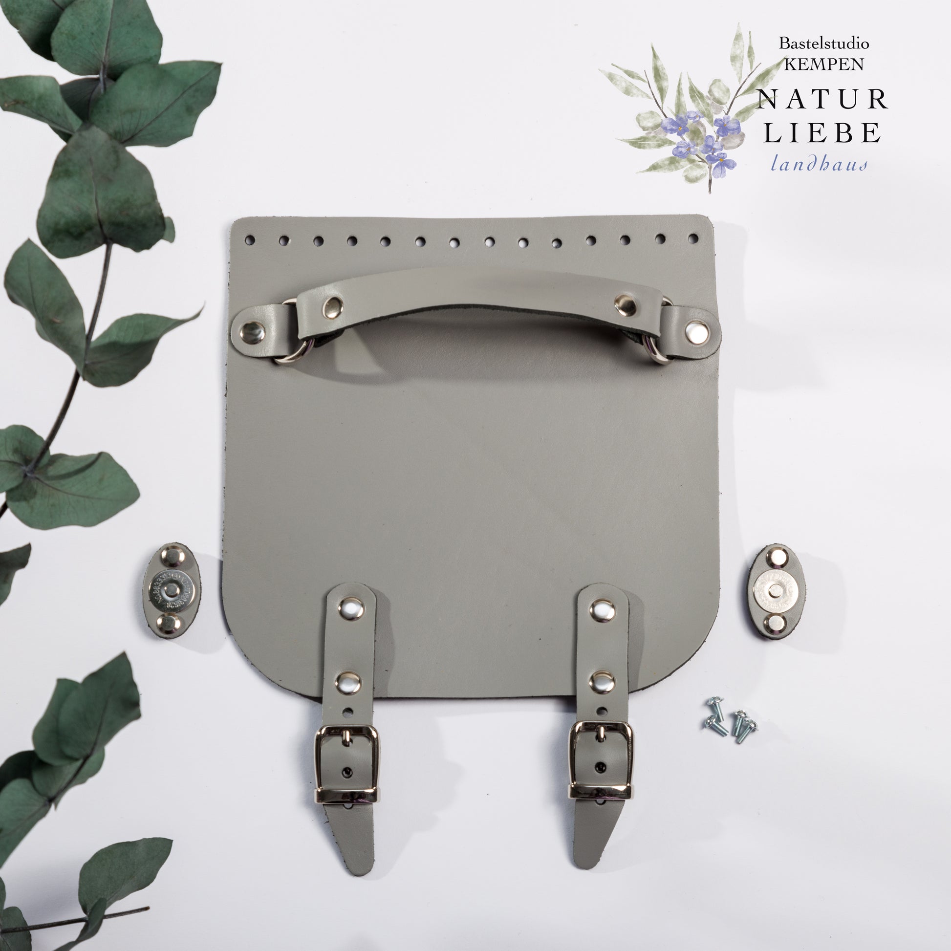 Oben an der Klappe befinden sich vorgestanzte Löcher zum einfachen Annähen. Der integrierte Handgriff sorgt für praktischen Tragekomfort. Zwei fest angebrachte, dekorative Riemchen mit schönen Metallschnallen dienen als stilvolle Verschlusselemente. An diesen Riemen ist bereits die obere Hälfte eines Magnetverschlusses befestigt. Die passende Gegenseite (Magnet-Gegenstück) wird separat an der Tasche angebracht – z. B. an einer gehäkelten Vorderseite. Die Kombination aus Funktionalität und stilvollem Design macht dieses Lederteil zu einem hochwertigen Accessoire für DIY-Taschenprojekte.